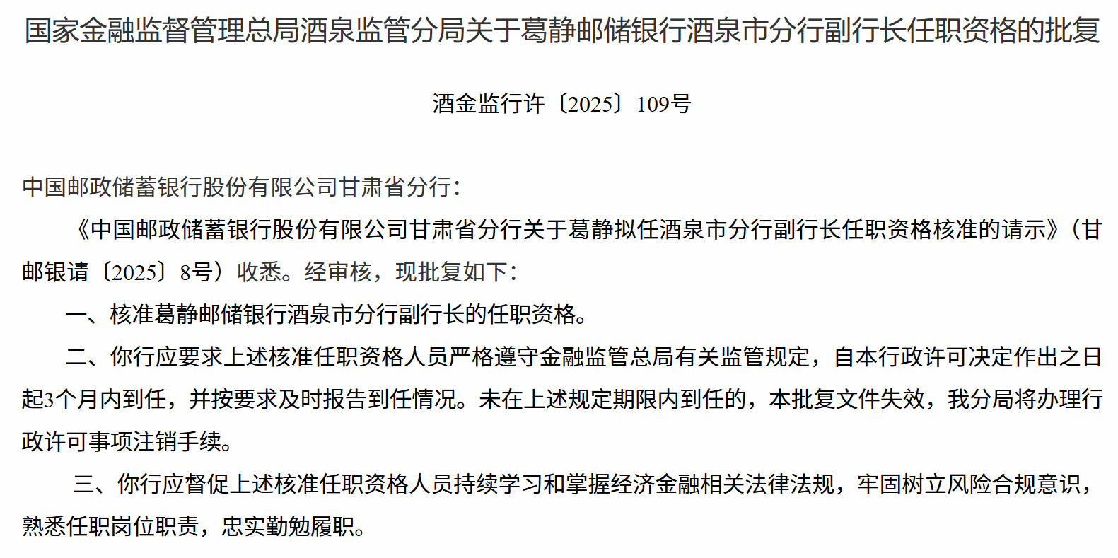 12月3日,国家金融监督管理总局酒泉监管分局发布关于葛静邮储银行酒泉市分行副行长任职资格的批复证券配资专业门户网,核准葛静邮储银行酒泉市分行副行长的任职资格。