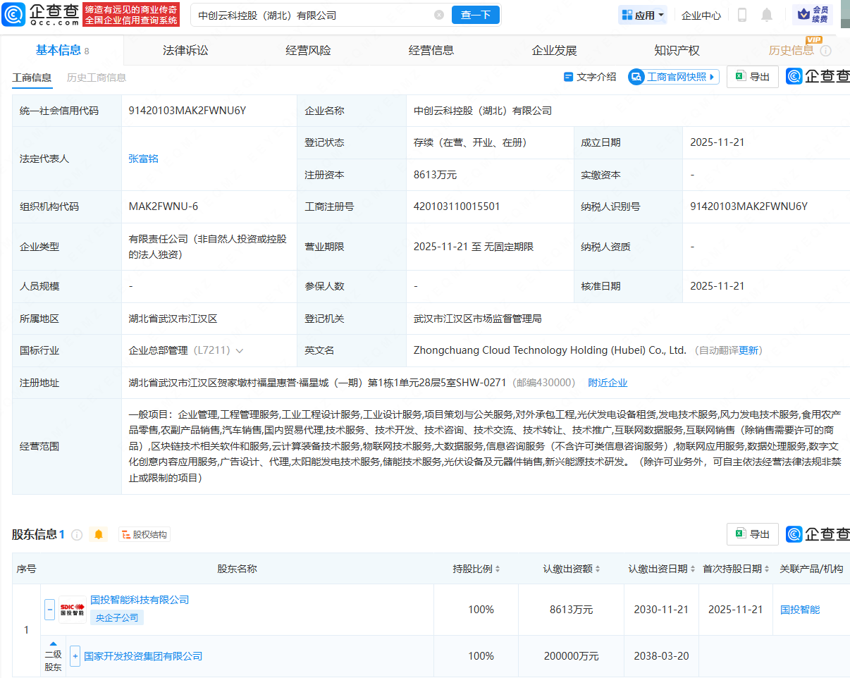 近日,中创云科控股(湖北)有限公司成立,法定代表人为张富铭配资官网开户,注册资本为8613万元,经营范围包含:光伏发电设备租赁,发电技术服务,风力发电技术服务,汽车销售,储能技术服务等。企查查股权穿透显示,该公司由国家开发投资集团有限公司旗下国投智能科技有限公司全资持股。